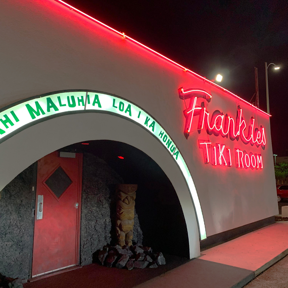 The interior of Frankie’s was built by Bamboo Ben, the world’s foremost tiki bar designer and grandson of Eli Hedley, famous for creating the décor at such fabulous destinations as the original Enchanted Tiki Room at Disneyland and the Las Vegas classic Aku Aku at the Stardust. Frankie’s also boasts original artwork and carvings by such renown artists as Shag, Bosko Hrnjak, Crazy Al Evans, Tom “Big Toe” Laura, Doug Horne and the revered godfather of all tiki carvers Leroy Schmaltz.